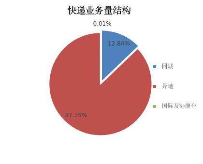 1-4月,同城、异地、国际及港澳台快递业务量分别占全部快递业务量的12.84%、87.15%和0.01%。
