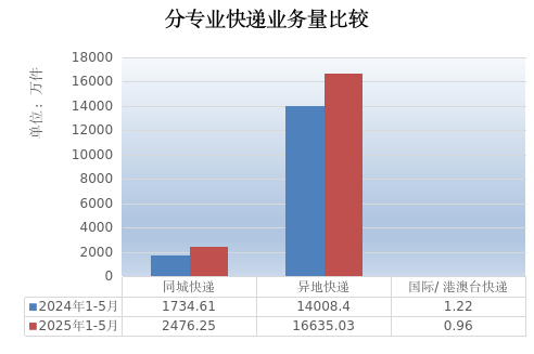 1-5月,同城业务量累计完成2476.25万件,同比增长42.76%;异地业务量累计完成16635.03万件,同比增长18.75%;国际及港澳台业务量累计完成0.96万件,同比下降21.14%。